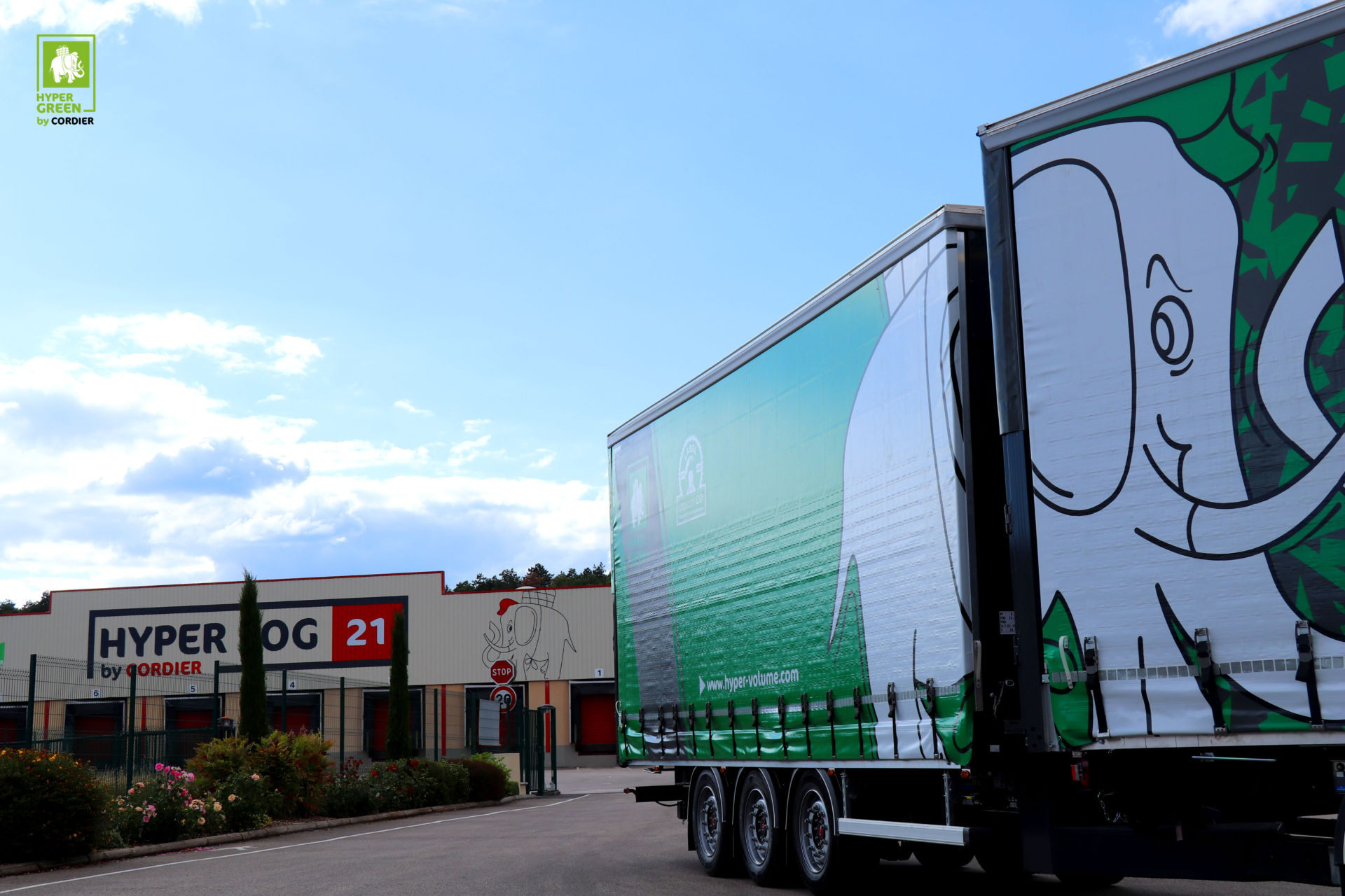 Leurs bâches sont explicites : ce sont deux véhicules décarbonés « Hyper Green » qui prennent part à notre nouveau plan transport lié au combiné rail-route.
