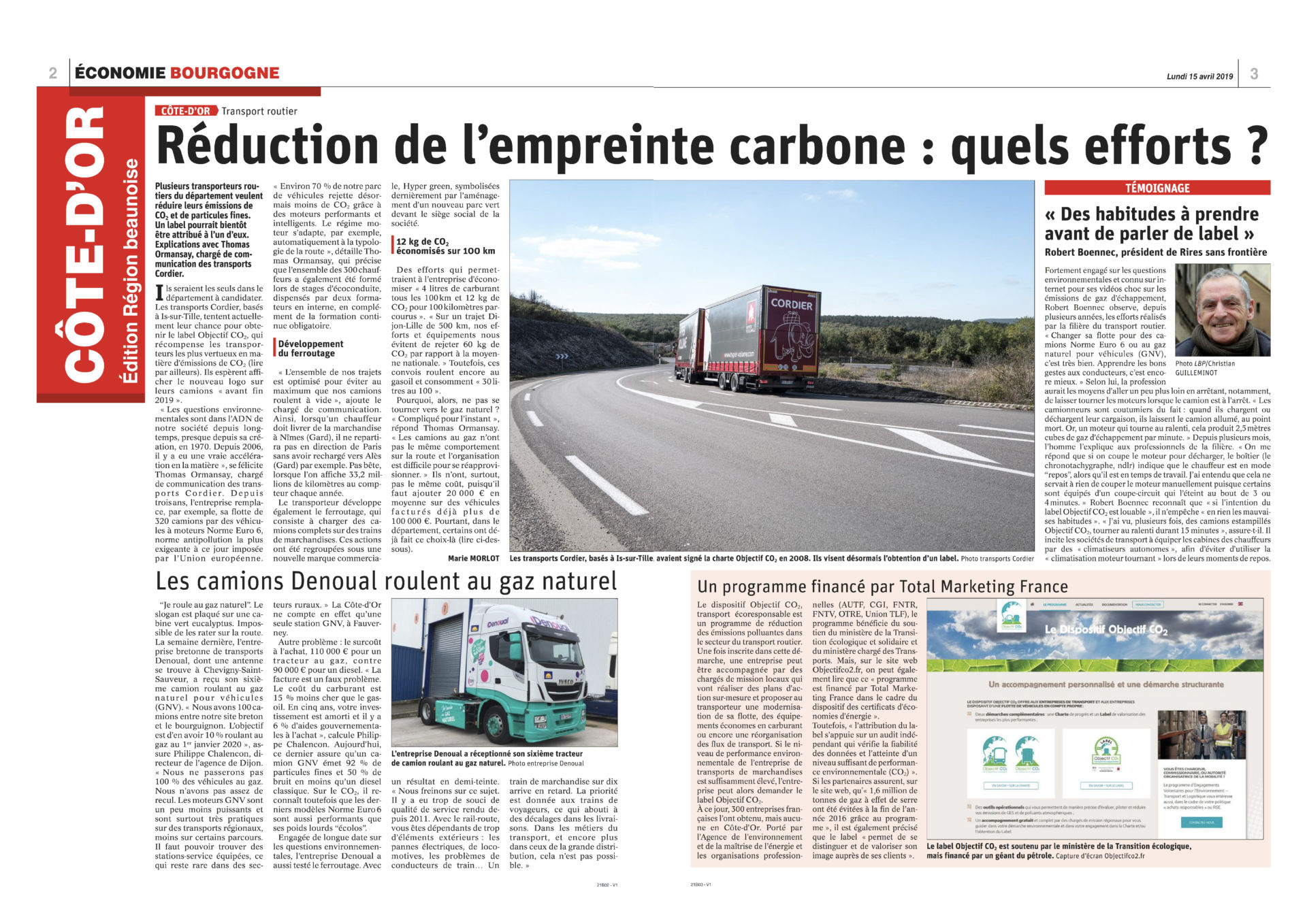 Lundi 15 avril 2019, le Bien Public a consacré une double page aux actions réalisées par les Transports Cordier pour réduire leur empreinte carbone.  Un focus est également réalisé sur l’objectif des Transports Cordier à moyen terme : le Label Objectif CO2.