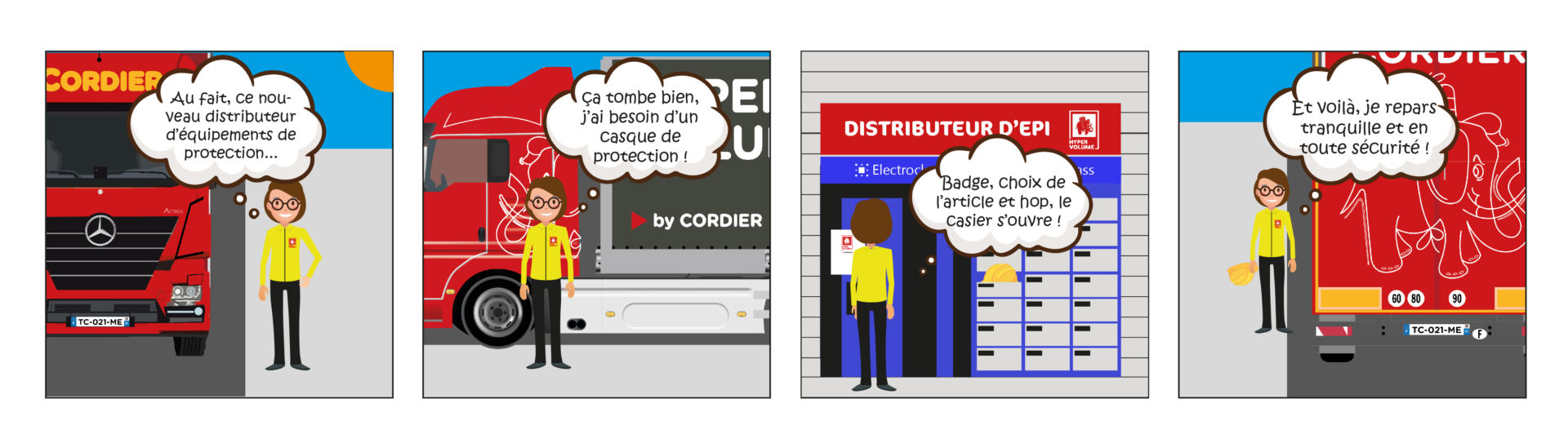Ce distributeur, approvisionné régulièrement en EPI, est disponible proche des ateliers mécaniques, lieu de passage de nos conducteurs. Pour obtenir les équipements souhaités, chaque employé doit s’identifier puis faire son/ses choix : casques, gants, chaussures de sécurité et autres outils de sécurité sont disponibles. Une nouveauté qui permettra d’accroître, un peu plus, la sécurité des conducteurs chez Transports Cordier.